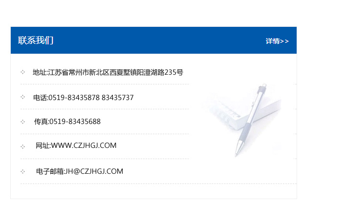 傳真:0519-83435688    郵編:213135    網址:WWW.czjhgj_com.symj888.com    電子郵箱:JH@czjhgj_com.symj888.com